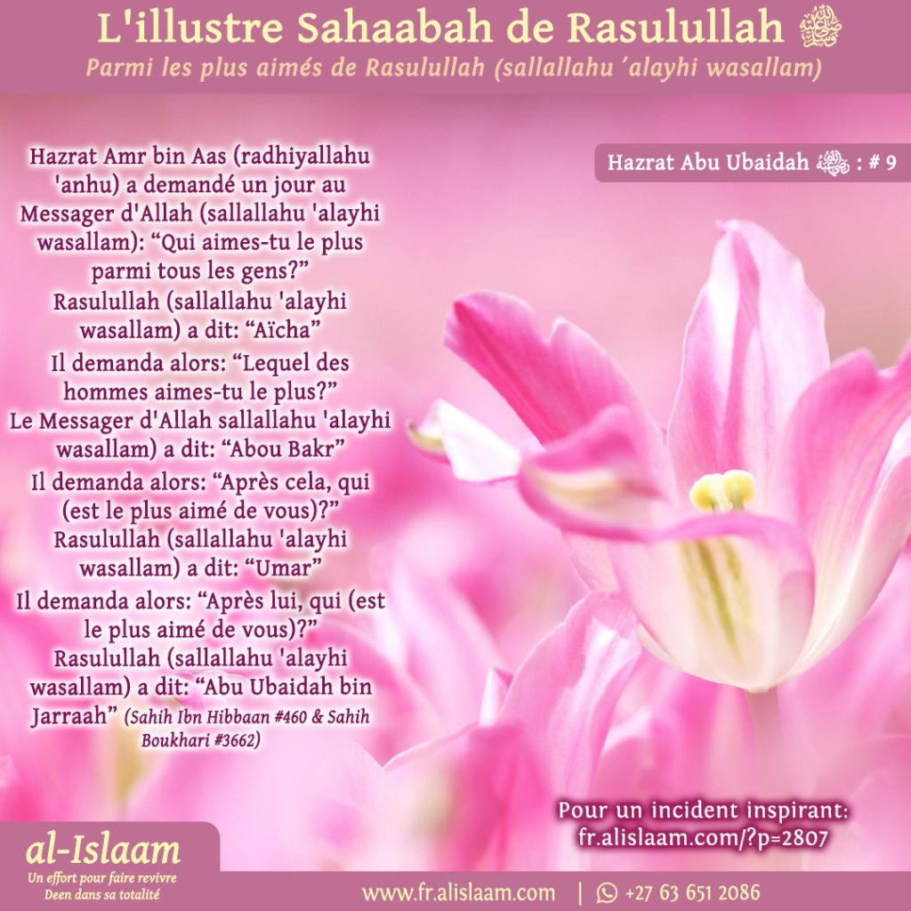 Cet incident montre que le Messager d’Allah (sallallahu alayhi wasallam) souhaitait montrer à la Oumma la position élevée et estimée de Hazrat Abu Ubaidah (radhiyallahu ‘anhu) afin qu’elle le respecte en conséquence.