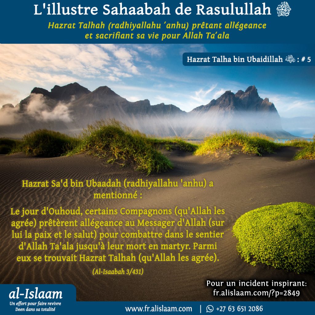 Le jour d’Uhud, lorsque les Compagnons commencèrent à fuir le champ de bataille, le Prophète (sallallahu ‘alayhi wasallam) fut laissé seul à un certain endroit avec seulement douze Compagnons présents avec lui. Parmi ces douze Compagnons se trouvait Hazrat Talhah ibn Ubaydillah (radhiyallahu ‘anhu).