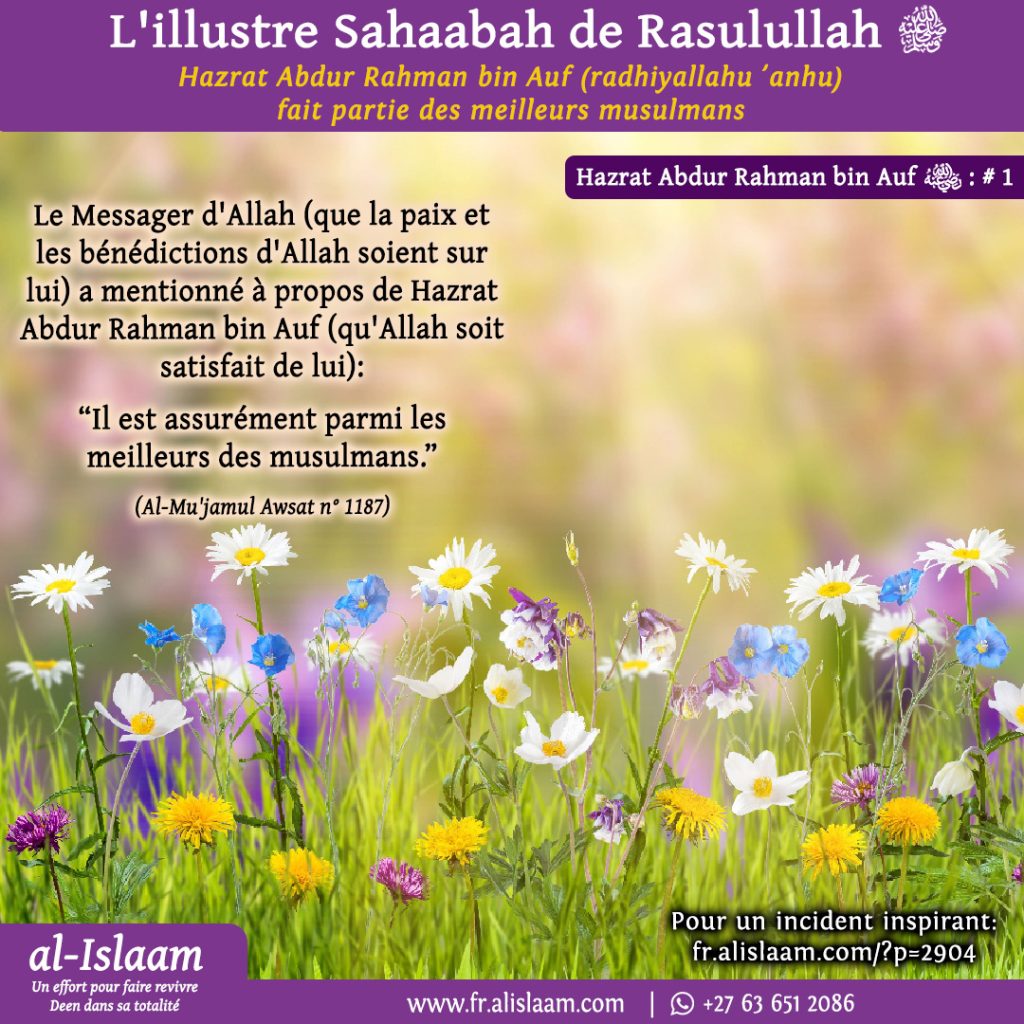 Sur ce, le Messager d’Allah (sallallahu ‘alaihi wasallam) lui dit : « Fais-la (ta nièce, Ummu Kulthoom) épouser Abdur Rahmaan bin Awf, car en vérité, il est parmi les meilleurs des musulmans, et quiconque parmi les musulmans lui ressemble est également parmi les meilleurs des musulmans. » (Al-Mu’jamul Awsat #1187)